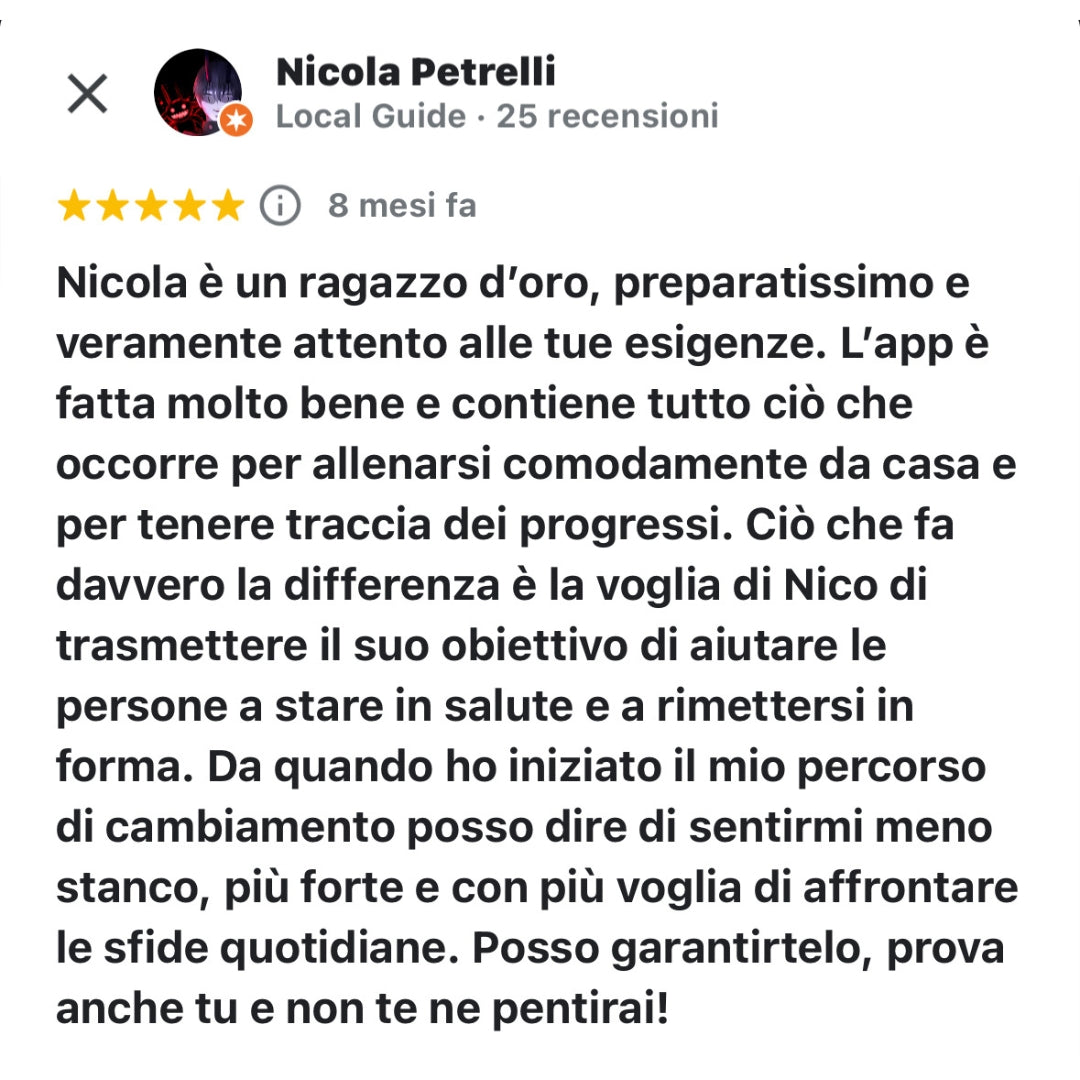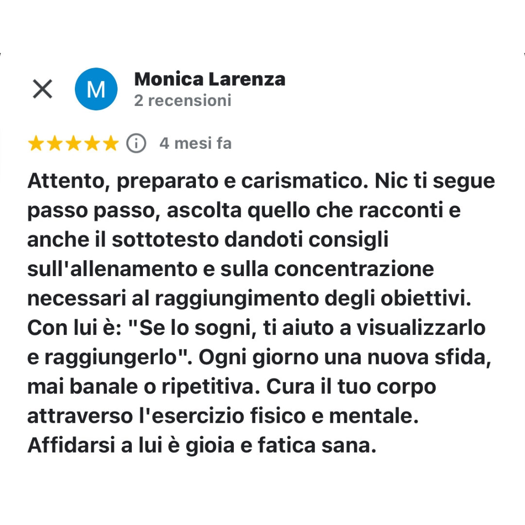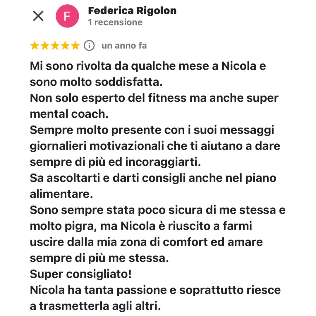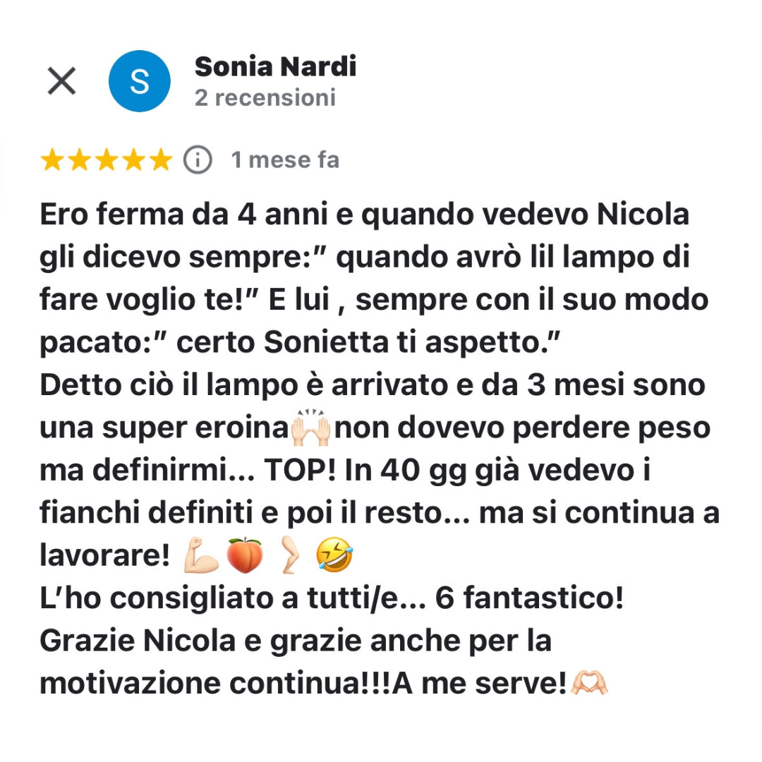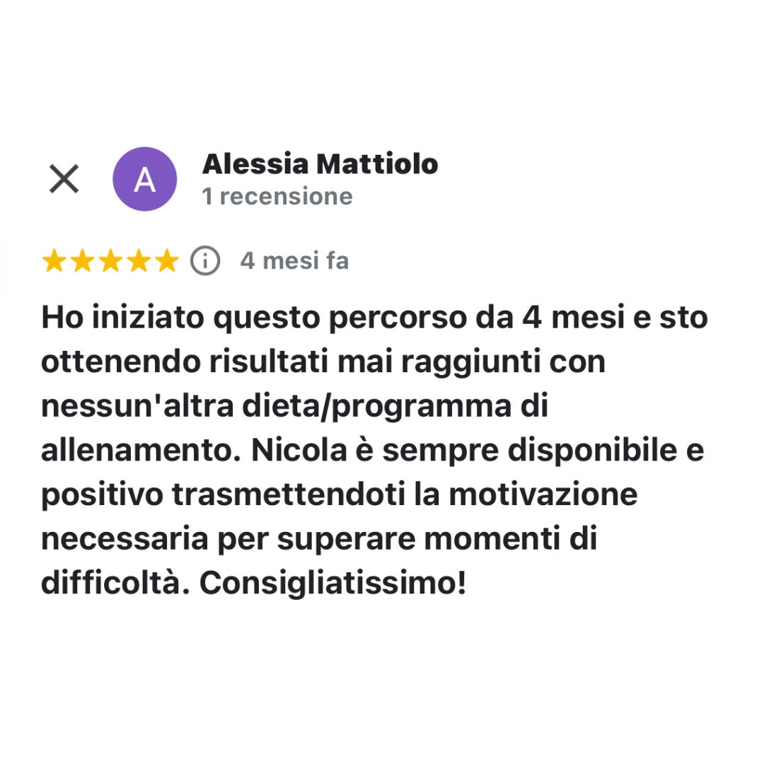 Quando la professionalità incontra la determinazione nasce una grande soddisfazione!!! Ho iniziato questo percorso spinta dalla voglia di voler essere seguita passo dopo passo per raggiungere la forma fisica che avevo in mente; la passione che Nicola ci mette in ciò che fa viene percepita fin da subito, dai primi approcci. Con un percorso personalizzato e studiato per il raggiungimento del tuo obiettivo ti segue passo dopo passo, con massima e piena disponibilità sia nello spiegarti come fare a rendere produttivo ogni singolo allenamento sia nel consigliarti cosa potrebbe aiutarti a raggiungerlo, il tutto accompagnato da costanti consigli nutrizionali. Un mental coach che ti stimola a dare qualcosa di più ogni giorno per spronarti a non mollare nei momenti in cui, diciamocela tutta, tanti si imbattono. E alla fine, se c’è il tuo impegno, i risultati arrivano. Da questi primi due mesi ne esco soddisfatta, i risultati ci sono, si vedono ma soprattutto si sentono. Quando ti guardi allo specchio e vedi riflessa l’immagine di te che piano piano si sta materializzando nel tuo ideale questo scaturisce una sensazione di assoluto benessere!