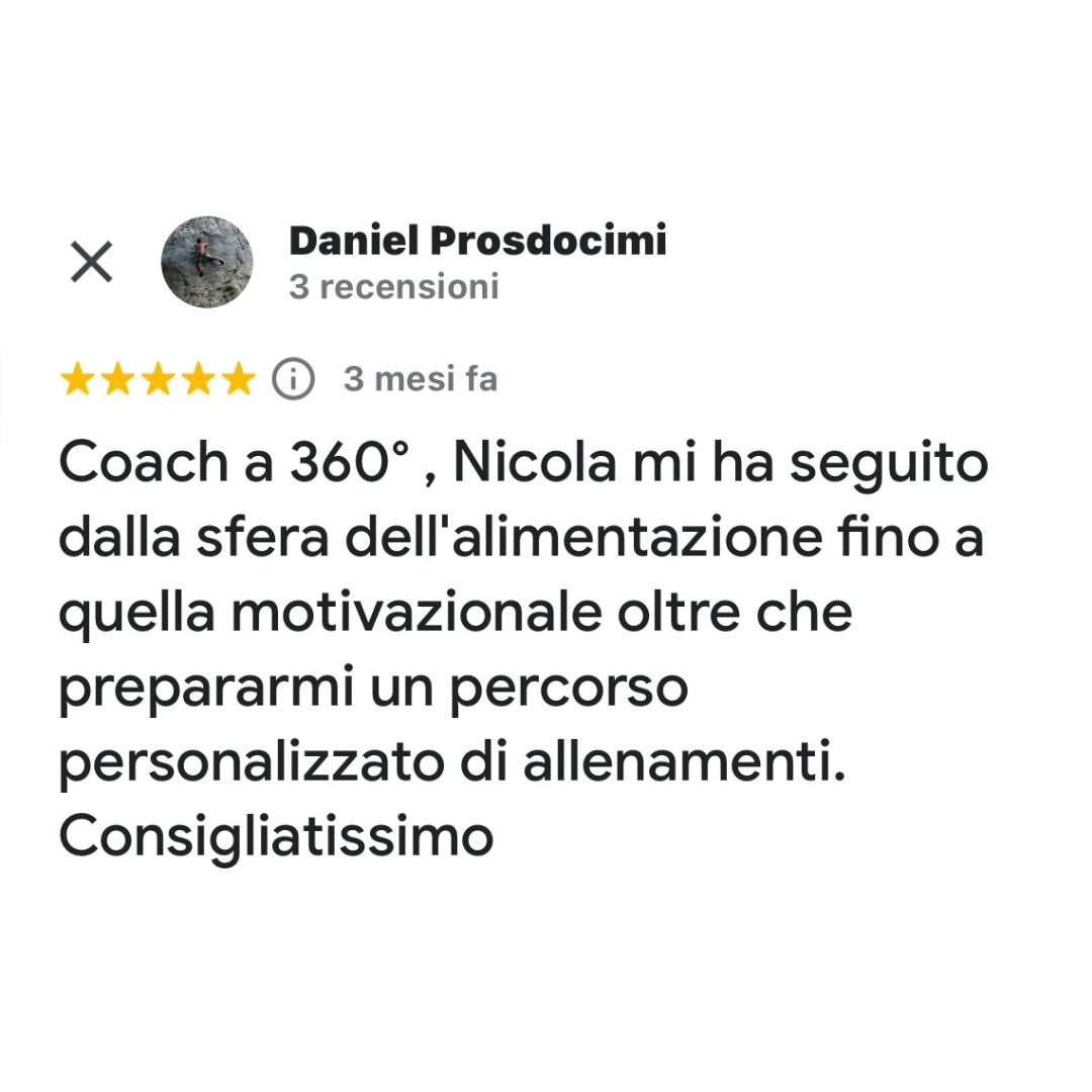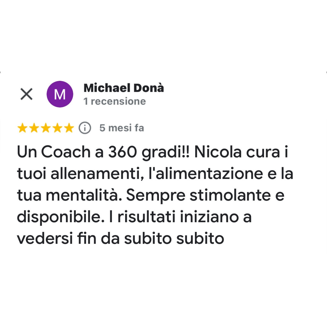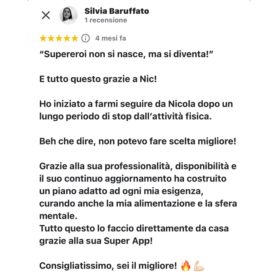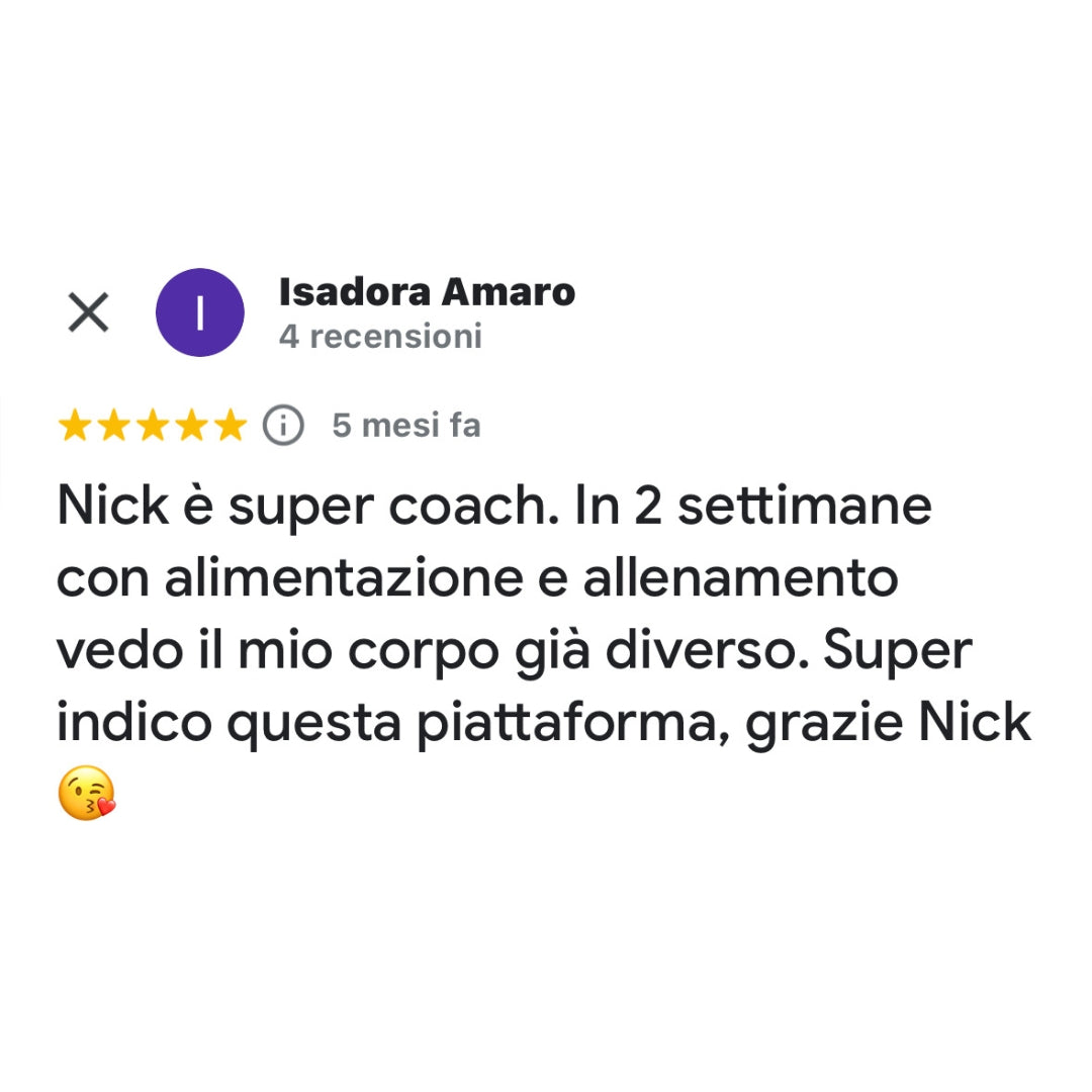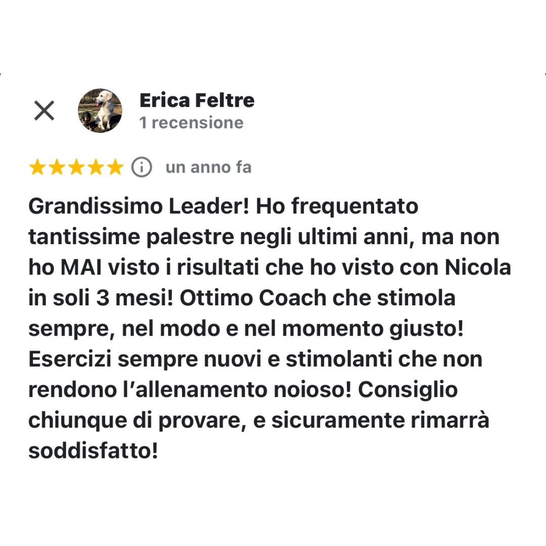 Quando la professionalità incontra la determinazione nasce una grande soddisfazione!!! Ho iniziato questo percorso spinta dalla voglia di voler essere seguita passo dopo passo per raggiungere la forma fisica che avevo in mente; la passione che Nicola ci mette in ciò che fa viene percepita fin da subito, dai primi approcci. Con un percorso personalizzato e studiato per il raggiungimento del tuo obiettivo ti segue passo dopo passo, con massima e piena disponibilità sia nello spiegarti come fare a rendere produttivo ogni singolo allenamento sia nel consigliarti cosa potrebbe aiutarti a raggiungerlo, il tutto accompagnato da costanti consigli nutrizionali. Un mental coach che ti stimola a dare qualcosa di più ogni giorno per spronarti a non mollare nei momenti in cui, diciamocela tutta, tanti si imbattono. E alla fine, se c’è il tuo impegno, i risultati arrivano. Da questi primi due mesi ne esco soddisfatta, i risultati ci sono, si vedono ma soprattutto si sentono. Quando ti guardi allo specchio e vedi riflessa l’immagine di te che piano piano si sta materializzando nel tuo ideale questo scaturisce una sensazione di assoluto benessere!