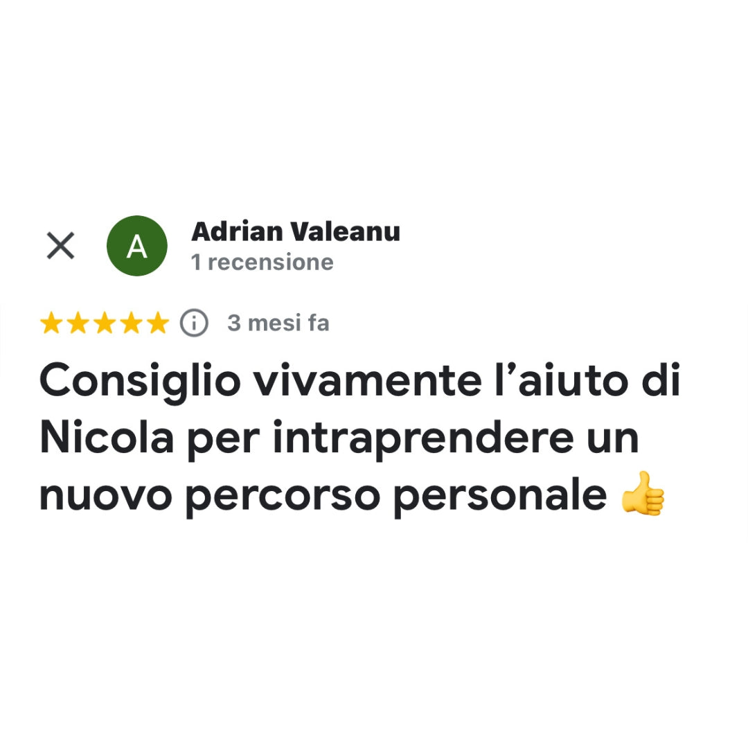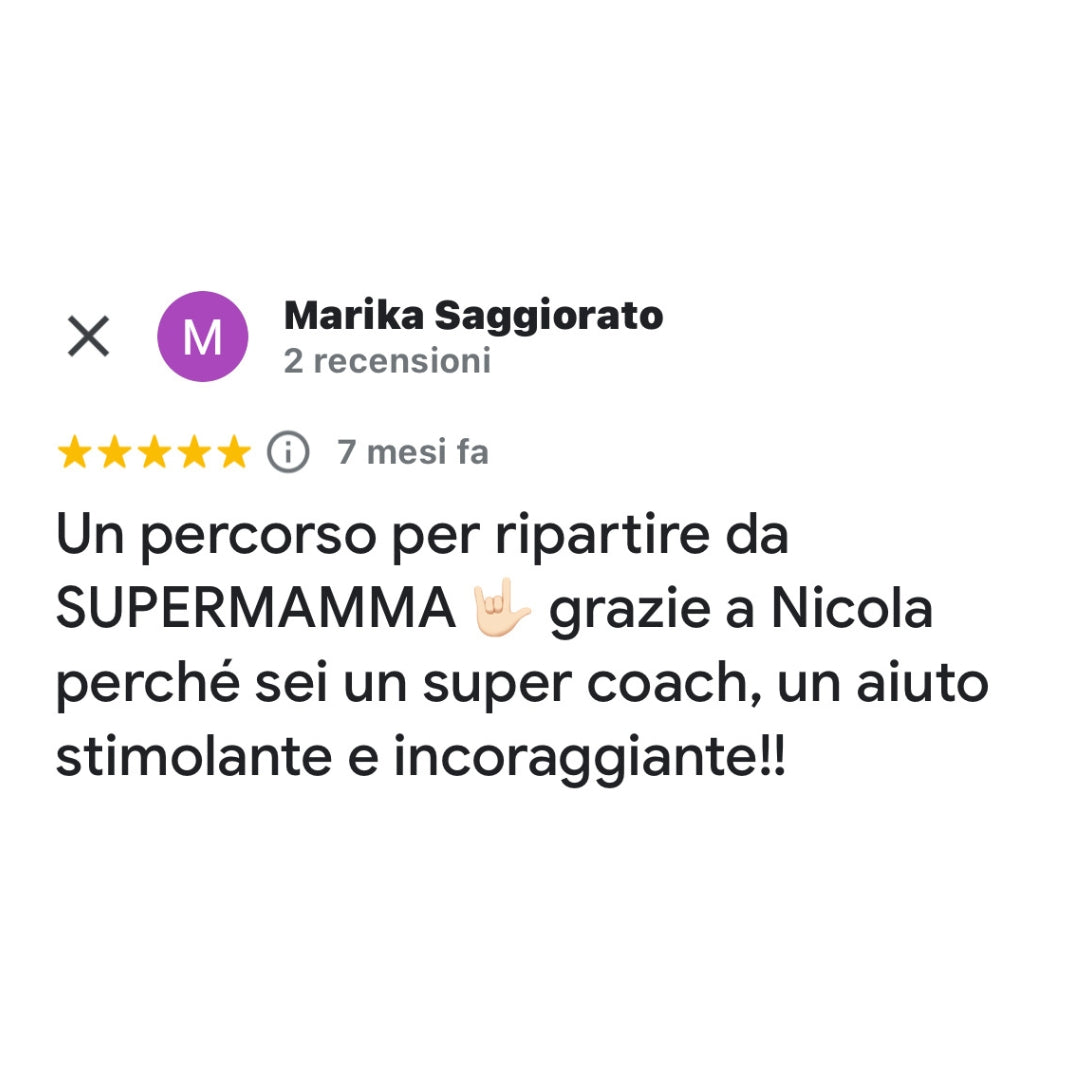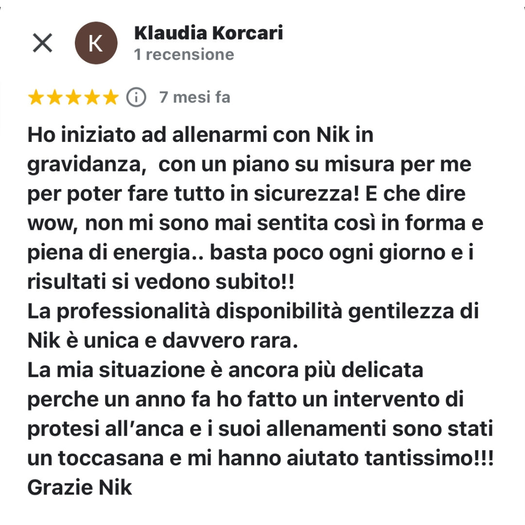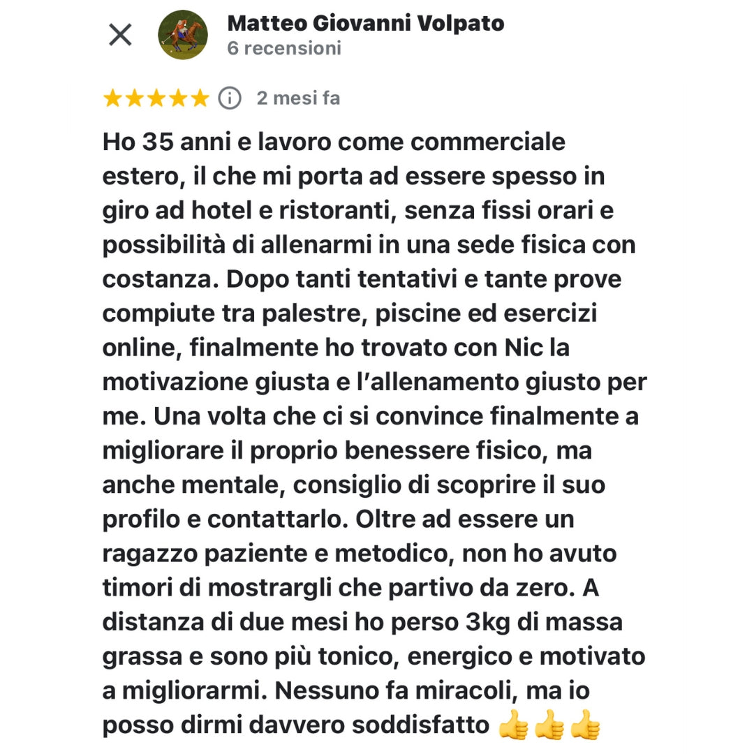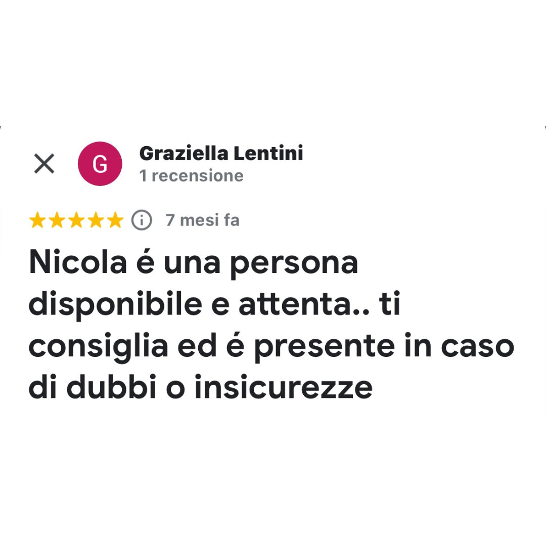 Quando la professionalità incontra la determinazione nasce una grande soddisfazione!!! Ho iniziato questo percorso spinta dalla voglia di voler essere seguita passo dopo passo per raggiungere la forma fisica che avevo in mente; la passione che Nicola ci mette in ciò che fa viene percepita fin da subito, dai primi approcci. Con un percorso personalizzato e studiato per il raggiungimento del tuo obiettivo ti segue passo dopo passo, con massima e piena disponibilità sia nello spiegarti come fare a rendere produttivo ogni singolo allenamento sia nel consigliarti cosa potrebbe aiutarti a raggiungerlo, il tutto accompagnato da costanti consigli nutrizionali. Un mental coach che ti stimola a dare qualcosa di più ogni giorno per spronarti a non mollare nei momenti in cui, diciamocela tutta, tanti si imbattono. E alla fine, se c’è il tuo impegno, i risultati arrivano. Da questi primi due mesi ne esco soddisfatta, i risultati ci sono, si vedono ma soprattutto si sentono. Quando ti guardi allo specchio e vedi riflessa l’immagine di te che piano piano si sta materializzando nel tuo ideale questo scaturisce una sensazione di assoluto benessere!